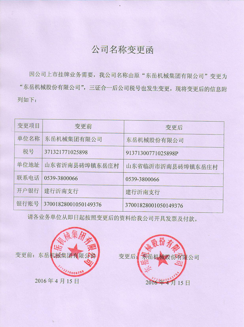 我公司更名為東岳機(jī)械股份有限公司